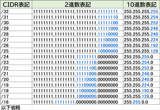まず、CIDR表記を2進数表記にするためにCIDR表記の値だけ左から「1」を並べ、残りを「0」で埋めます。