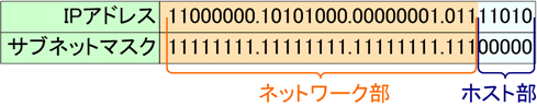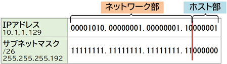 サブネットマスクが「1」の部分がネットワーク部になり、「0」の部分がホスト部になります。