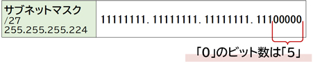 まずサブネットマスク「/27」の2進数表記における「0」のビット数を確認します。サブネットマスクは32ビットなので、「32 - 27 = 5」として求められます。