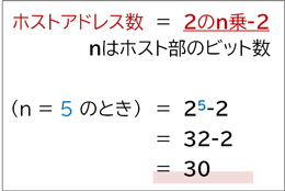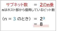 またサブネット数は、ホスト部から借用しているビット数を「n」としたとき、次の公式から求められます。