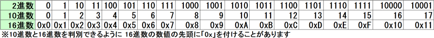 「0~17」をそれぞれの方法で表記すると以下のようになります。