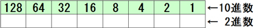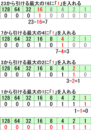 変換したい10進数の数値を変換表の大きい方から引いていき、引いた部分に「1」を入れます。