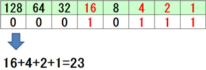 変換したい2進数の数値を変換表に入れて、「1」が入った部分を全て足します。(表には右詰めで入れます)