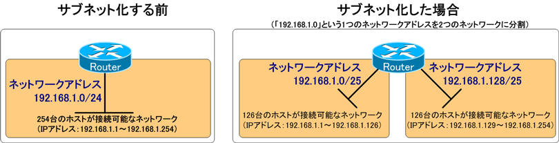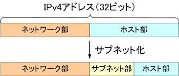 サブネット化(ネットワークを分割)するには、IPアドレスの「ホスト部」の一部を借用して「ネットワーク部」として扱います。