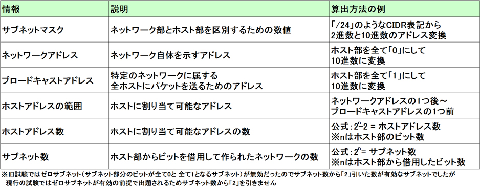 サブネット(ホスト部からビットを借用して作られたネットワーク)に関する以下の情報は、提示されたIPアドレスやサブネットマスクを使用して算出します。