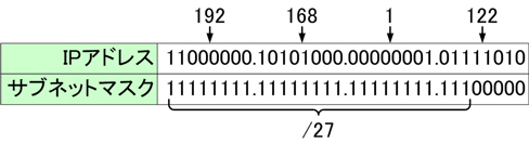 以下では「192.168.1.122/27」というIPアドレスとサブネットマスクを例に説明します。