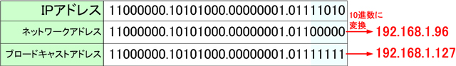 ネットワークアドレスは、ホスト部が2進数で全て「0」になるアドレスなので「192.168.1.96」になります。