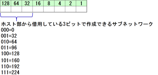 「192.x.x.x」はクラスC「/24」に該当します。つまり「192.168.1.x/27」は、ホスト部からネットワーク部に3ビット借用してサブネットを作成していることになります。