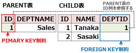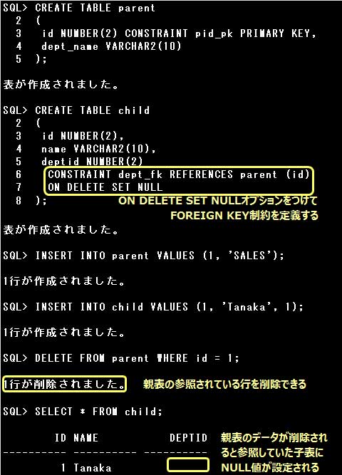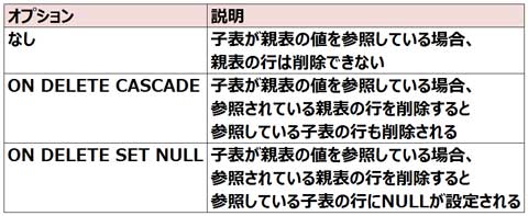 FOREIGN KEY制約では、ON DELETE CASCADEオプションやON DELETE SET NULLオプションと組み合せて定義することもできます。これらのオプションを指定することで、親表のデータを削除した場合に、FOREIGN KEY制約を定義した子表のデータをどのようにするかを指定できます。