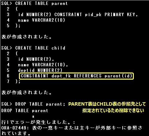 FOREIGN KEY制約の親表として指定された表は、参照されている行がない場合でも削除できなくなります。親表を削除したい場合は、FOREIGN KEY制約を定義した表を削除してから親表を削除します。