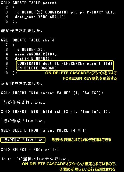 ・ON DELETE CASCADEオプションを指定すると、親表の行を削除する際に、親表を参照している子表の行も自動的に削除する