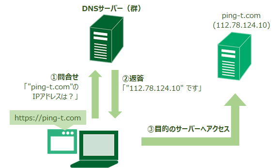DNSサーバーへのアクセスができないと、「ping-t.com」などの文字列をIPアドレスに変換することができません。