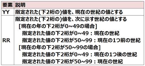 日付書式の要素である「YY」と「RR」はどちらも年の下2桁を表しますが、世紀の取扱に違いがあります。