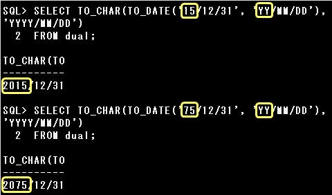 現在の年が2012年の場合に、日付書式を「YY」、「RR」、値を15、75とすると、それぞれ次のようになります。