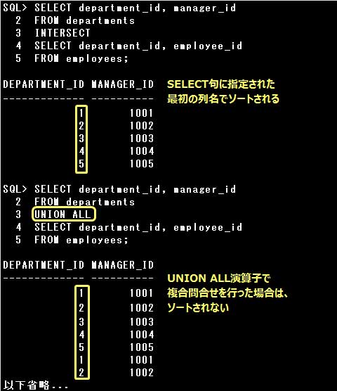 4つの演算子のうち、UNION ALL演算子以外の演算子を使用した複合問合せでは、問合せの結果がSELECT句の1番目に指定されている列で昇順にソートされます。