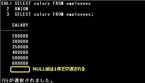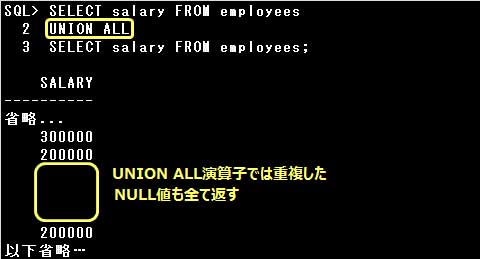 ・UNION ALL演算子以外の演算子を使用した複合問合せでは、重複したNULL値は排除される