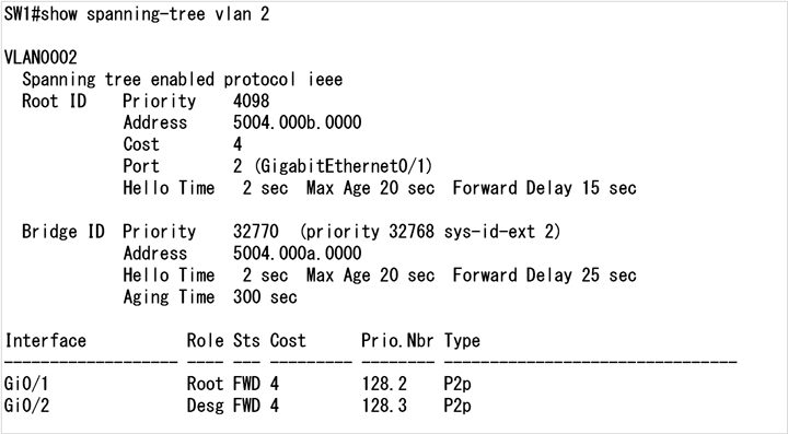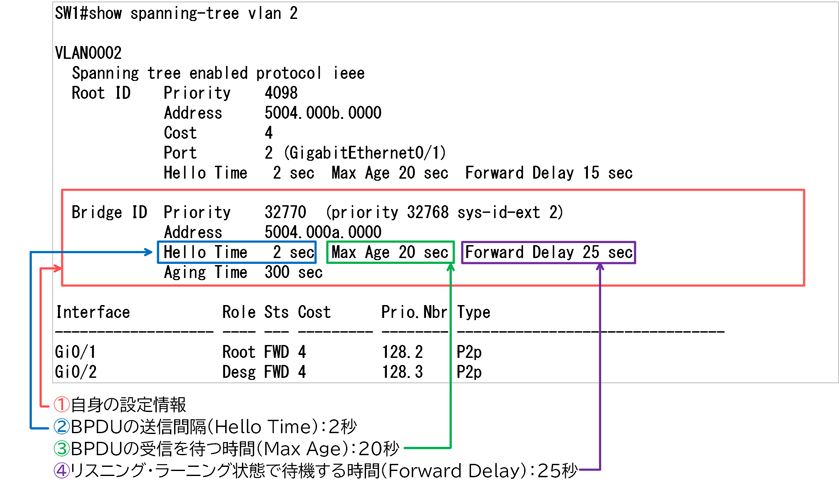 SW1自身に設定されている情報を確認するには「Bridge ID」の情報を確認します。「Forward Delay」の値は「25秒」に設定されていることが分かります。