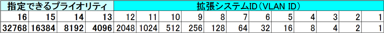 なお、拡張システムIDを使用する場合、「ブリッジIDの形式」の図にあるように、通常16ビットあるプライオリティのうち12ビットは拡張システムID(VLAN ID)で使用するので、実際に指定できるプライオリティは上位4ビットの部分のみです。従って、プライオリティは4096の倍数で指定することになります。