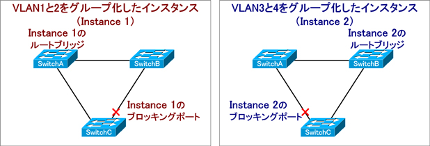 複数のVLANを1つのグループにまとめてインスタンスを構成するため、負荷分散などの設計を柔軟に行えます。