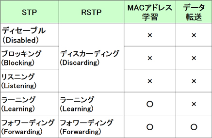 RSTPのポートの状態は Discarding,Learning,Forwardingの3種類で、STPに比べてDiscardingが新たに定義されました。(逆にSTPのDisabledとBlockingとListeningはDiscardingに統合されて無くなりました。)