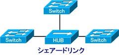 シェアードリンクに分類されるのは、スイッチ間にハブが入っている接続です。また、スイッチのポートが半二重に設定されている場合もシェアードリンクに分類されます。