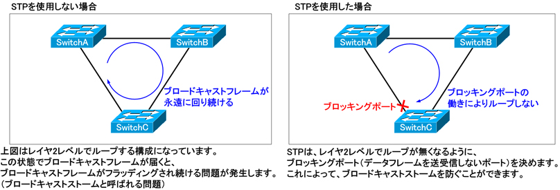 STPとは、冗長構成のスイッチドネットワークでレイヤ2のループを防ぐために考え出された機能です。