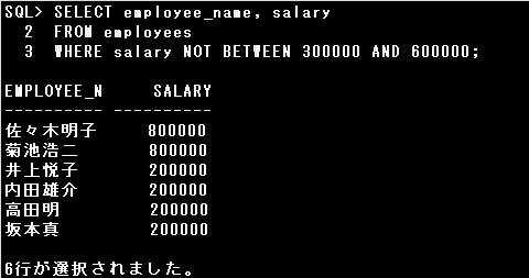 上記ではSALARY列が300000より小さいか、600000より大きい行が検索されます。300000、600000の行は検索結果に含まれません。つまり以下のSQLと同じです。