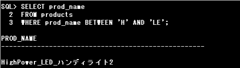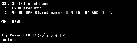 設問の場合は、UPPER(prod_name)で全て大文字に変換された商品名の頭文字が「H」で始まるものから、「LE」という2文字の文字コードの範囲までが検索されます。