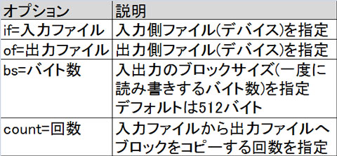 ddコマンドの書式と主なオプションは以下のとおりです。