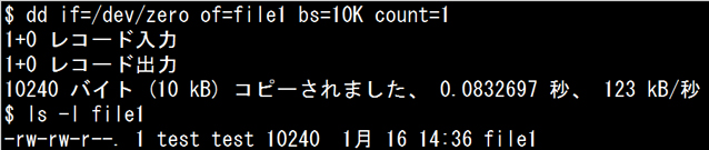 cpコマンドと異なり、ブロックサイズ(bsオプション)とそのブロックをコピーする回数(countオプション)を指定してファイルを作成することができます。