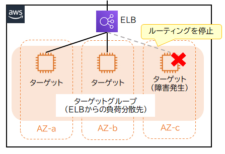 ELBはターゲットグループ内の各ターゲットが正常に動作しているかを定期的にヘルスチェックで確認します。ターゲットから正常に応答が返ってくれば、ELBはそのターゲットへのルーティングを継続します。もしターゲットが異常であると判断された場合は、ELBはそのターゲットへのルーティングを停止します。