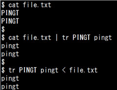 なお、trコマンドは変換対象を標準入力からのみ受け付けます。つまり、変換・削除したい文字列が記載されているファイルをコマンドの引数として指定することが出来ません。そのため、以下のようにパイプ(|)やリダイレクト(<)を使用してファイルを指定します。