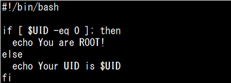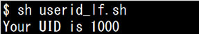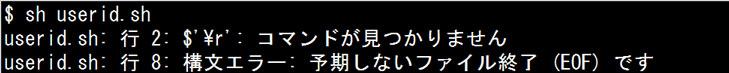例えばWindowsのメモ帳で以下の様なユーザーIDを表示させるシェルスクリプトを作成、userid.shという名前で保存し、改行コードの変換などを行わずLinux側に送信してみます。