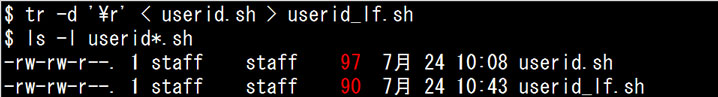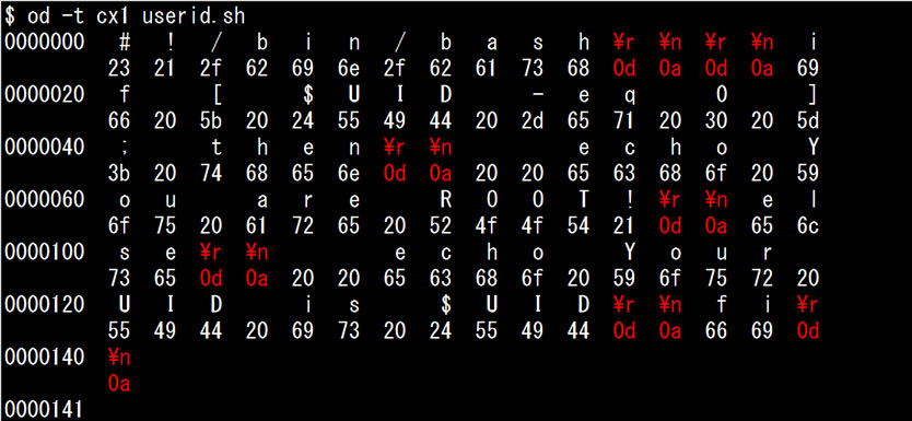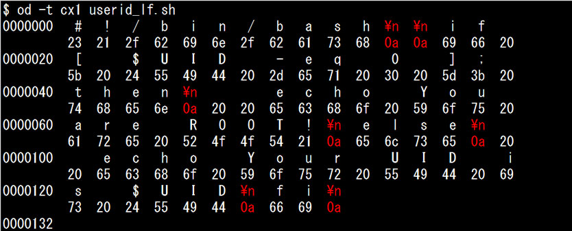 改行の位置にあったCR(\r)がなくなり、LF(\n)のみになっていることがわかります。不要な改行コードがなくなったので、シェルスクリプトも正常に実行されるようになります。