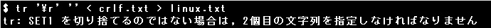 tr -d '\r' < crlf.txt > linux.txt となっています
