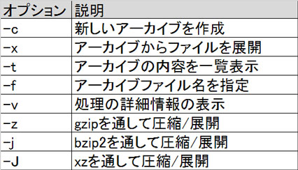 なお、tarコマンドではオプションの「-」は省略できます。オプションは順不同でも動作しますが、慣習的にはc, x, tのような動作オプションを先頭に指定します。