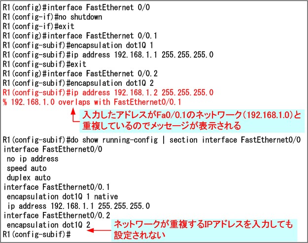 サブインターフェースは各VLANのデフォルトゲートウェイになるため、それぞれ別のネットワークを指定する必要があります。