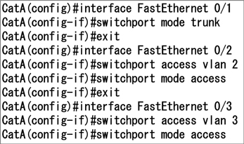 上記ネットワークでルータ・オン・ア・スティックによるVLAN間ルーティングを行うためにスイッチに以下の設定を行っている。