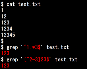 また、「[^2-3]23$」は、「2から3以外の1文字」に続けて、「2」、さらに行末が「3」であることを表します。