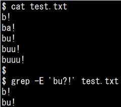 なお「?」は拡張正規表現ですので、grepコマンドの「-E」オプションを使用するか、egrepコマンドを使用する必要があります。