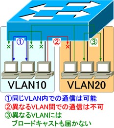 VLANで論理的にグループ分けすることにより、異なるVLANに属しているユーザとは通信できないようになります。