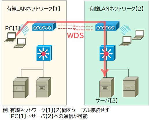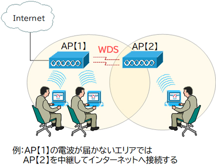 WDS(Wireless Distribution System)はAP同士を無線接続する機能を指します。WDS機能を持ったAPでは以下のことが可能になります。