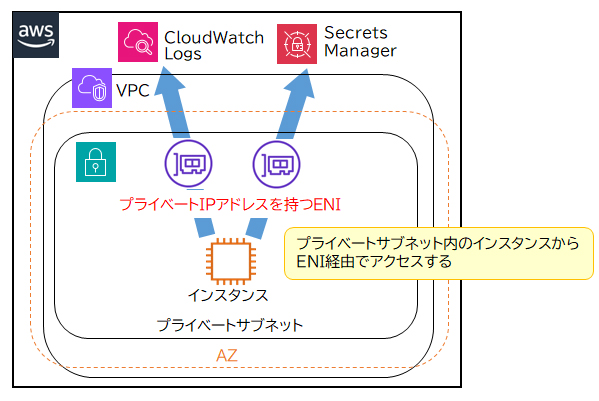 CloudWatch LogsやSecrets Manager(※)などの多数のVPC外AWSサービスで利用できます。接続元リソースがあるサブネットにプライベートIPアドレスを持つENIを作成し、ENIと接続先サービスをリンクしてアクセスします。
