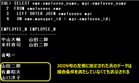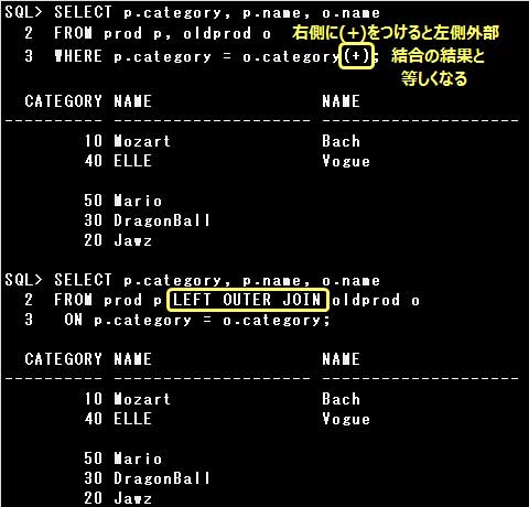 また、Oracle独自の結合構文で外部結合を行えます。その際は外部結合演算子(+)を使用します。