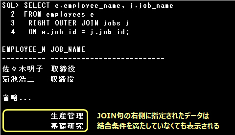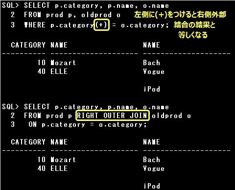 Oracle独自の結合構文での外部結合では、WHERE句に指定した条件の左側に(+)をつけると右側外部結合、右側につけると左側外部結合の結果と等しくなります。