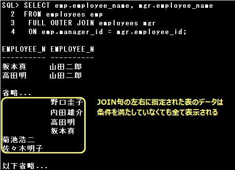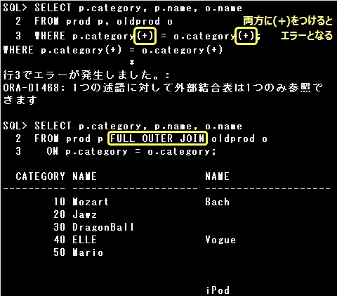 なお、Oracle独自の結合構文での外部結合では、完全外部結合は行えません。WHERE句の条件の両方に(+)をつけるとエラーとなります。