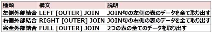 結合条件を満たしたデータのみを取り出すのではなく、検索条件を満たしていないデータも一緒に取り出す方法を外部結合といいます。