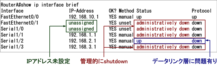 インターフェースのレイヤ3(IP)の状態などを表示します。
