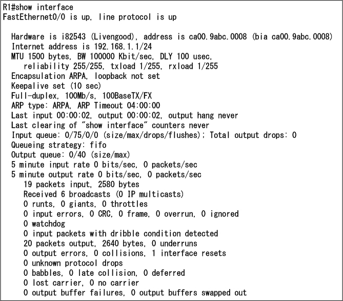 インタフェースのレイヤ1とレイヤ2の状態や送受信したパケット数などの統計情報を表示します。