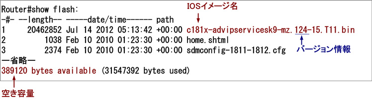 Flashメモリの空き容量や使用量、Flashメモリに格納しているファイル(IOSなど)を表示します。
